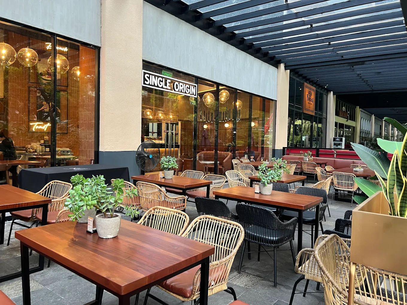 Single Origin's Greenbelt 5 branch features the same industrial-chic design with brick walls, high ceilings, and wall-to-ceiling shelves showcasing fine wines, craft beers, and coffee products. The spacious, airy café offers specialty single-origin coffee, comfort food, and craft cocktails in a laidback atmosphere, making it perfect for breakfast, after-work hangouts, and casual catch-ups with friends in the heart of Makati's premier shopping district.